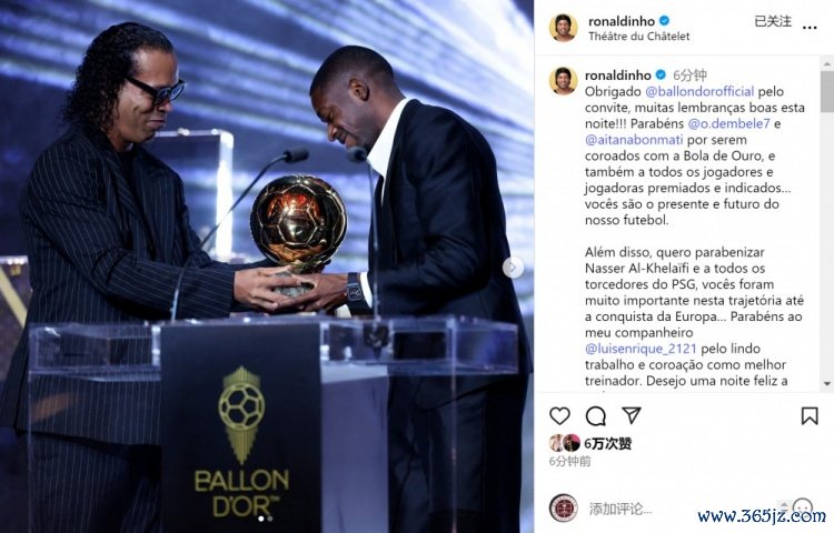 罗纳尔迪尼奥社媒晒出颁奖照片,