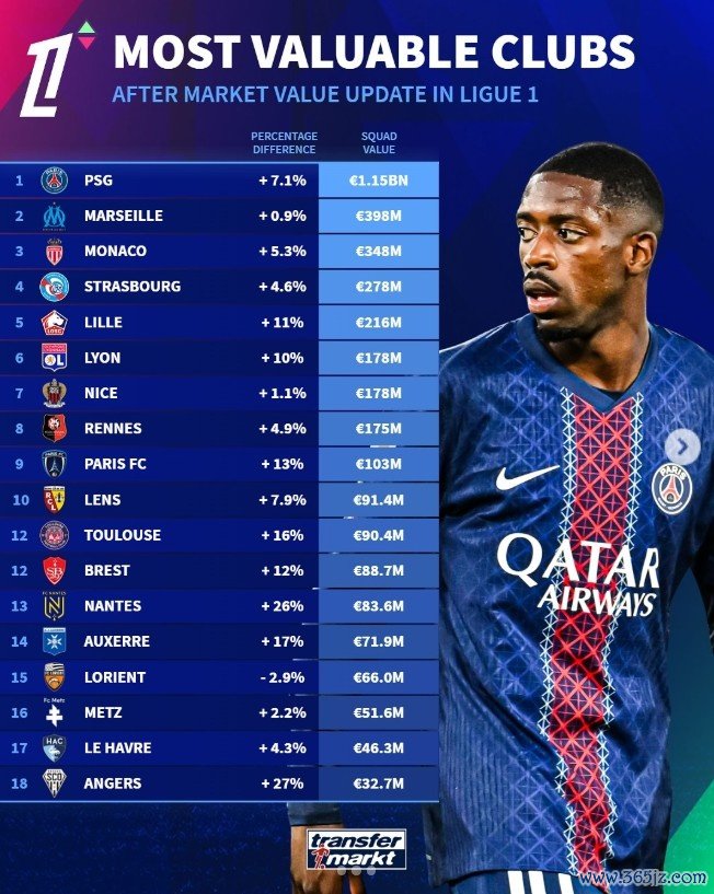 法甲俱乐部身价排行:巴黎11.5亿欧断层领跑 ,马赛3.98亿欧次之