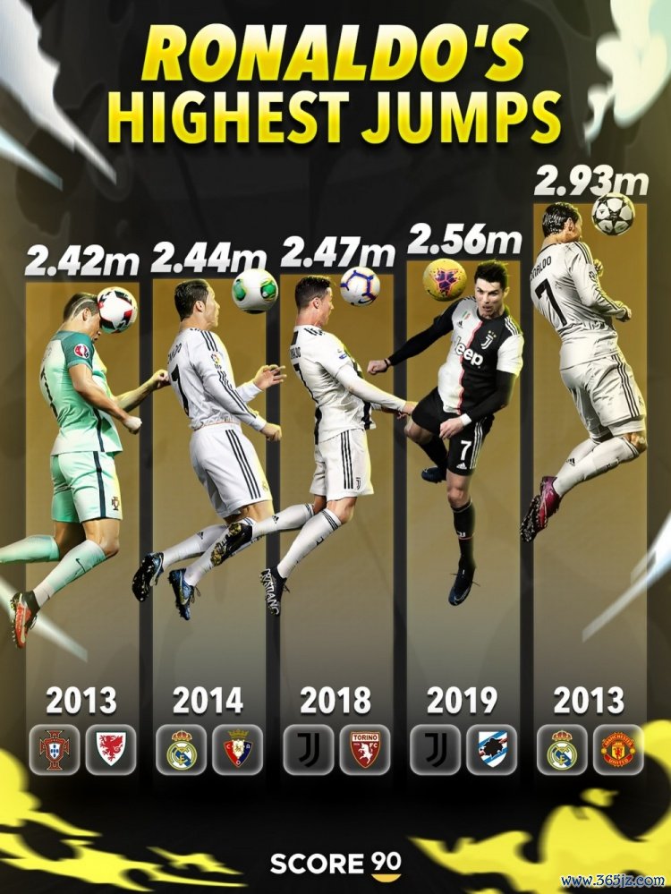 10月12日讯 Score90统计了C罗职业生涯至今最高的五次弹跳 , 聚焦体育视界NBA直播2013年对阵曼联高度达到2.93米居首。