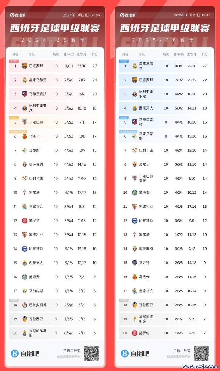 10月27日讯 西甲第10轮,皇马2-1击败巴萨,西甲开局9胜1负5分领跑,巴萨排第2。