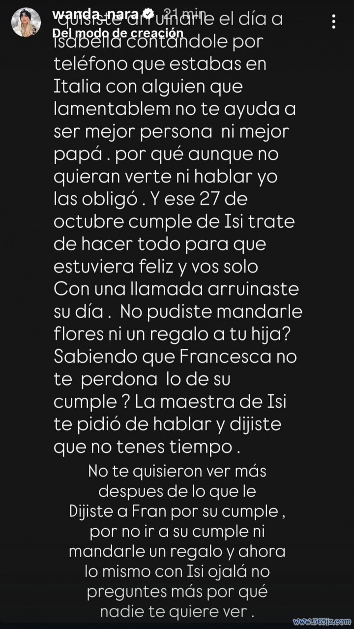 旺达:你想通过电话告诉伊莎贝拉你很遗憾在意大利和一个不能让你成为更好的人、也不能让你成为更好爸爸的人在一起每日一冷曼联院长,以此毁掉她的一天。尽管她们不想见你、不想和你说话,我还是强迫她们(和你联系)。10 月27日伊西的生日,我尽力让她开心,而你只打了一个电话就毁了她的一天。你就不能给你女儿送束花或一份礼物吗?你明知弗朗西斯卡还没原谅你没参加她的生日、没送她礼物,现在对伊西又故技重施。但愿你别再问为什么没人想见你了。