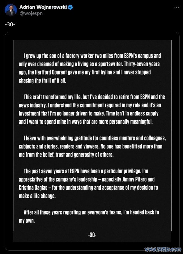 9月18日讯 1年前的今天,名记Adrian Wojnarowski发文宣布结束自己30年的记者生涯,宣布退休!