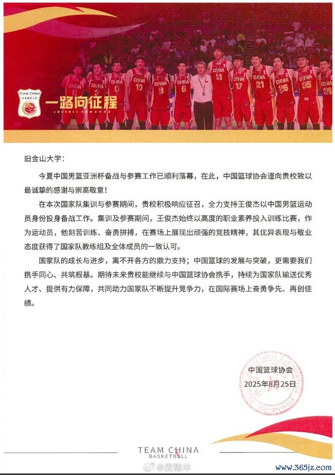 10月16日讯 今天,媒体人麦穗丰在社媒上晒出了中国篮协发给旧金山大学的感谢信。