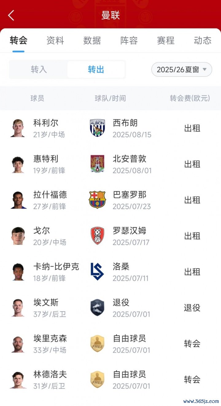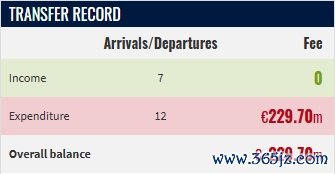 曼联25/26赛季夏窗收支:0收入,2.29亿欧支出