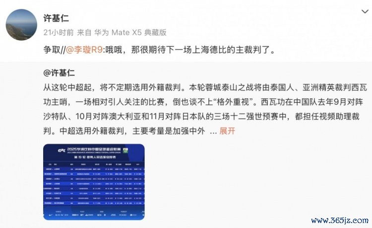 8月3日讯 对于网络上呼吁下一轮中超上海德比邀请洋哨的声音,足协副主席许基仁在个人社媒予以了回应。