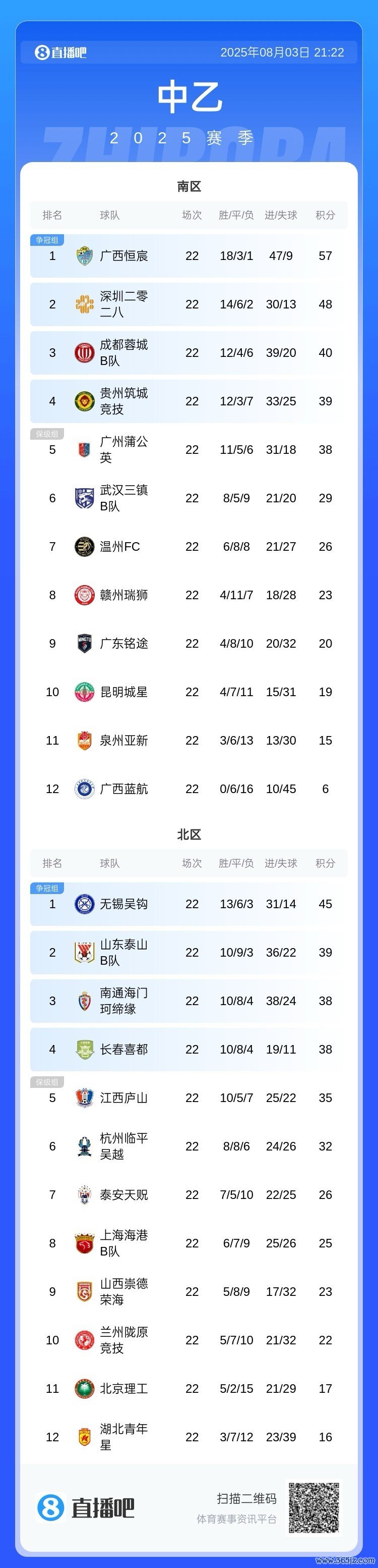 8月3日讯 中乙常规赛阶段22轮结束,广西恒宸、深圳二零二八、蓉城B队以及贵州筑城竞赛 位居南区前四晋级下一轮 争冠组,葡超新闻网直播吧无锡吴钩、泰山B队、南通海门珂缔缘、长春喜都北区前四晋级下一轮 争冠组。