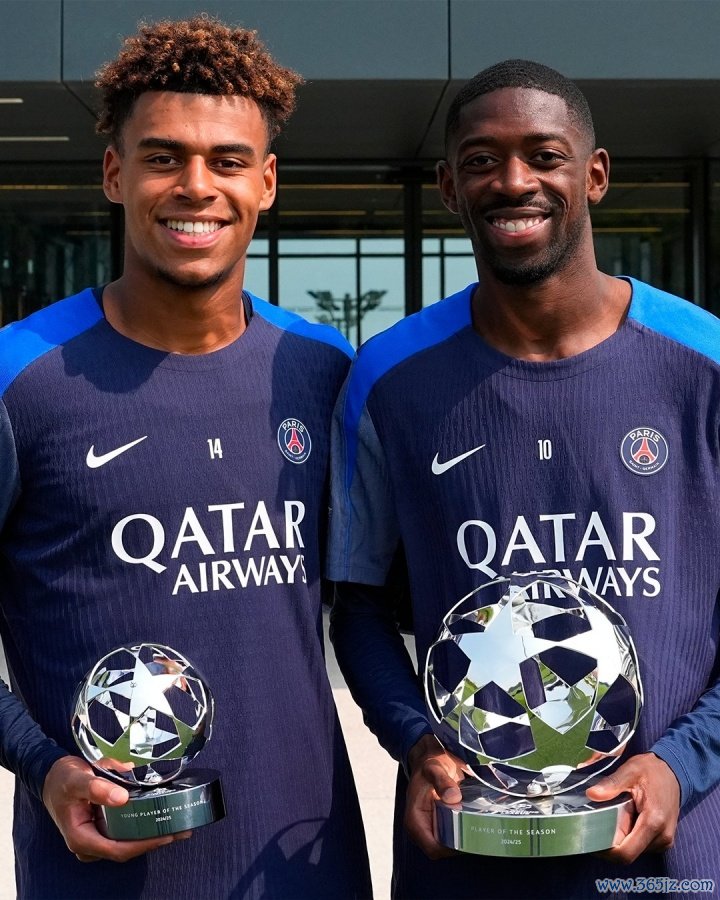 8月17日讯 巴黎官方社媒晒照,登贝莱以及杜埃领取了上赛季欧冠最佳球员以及欧冠最佳年轻球员奖杯。